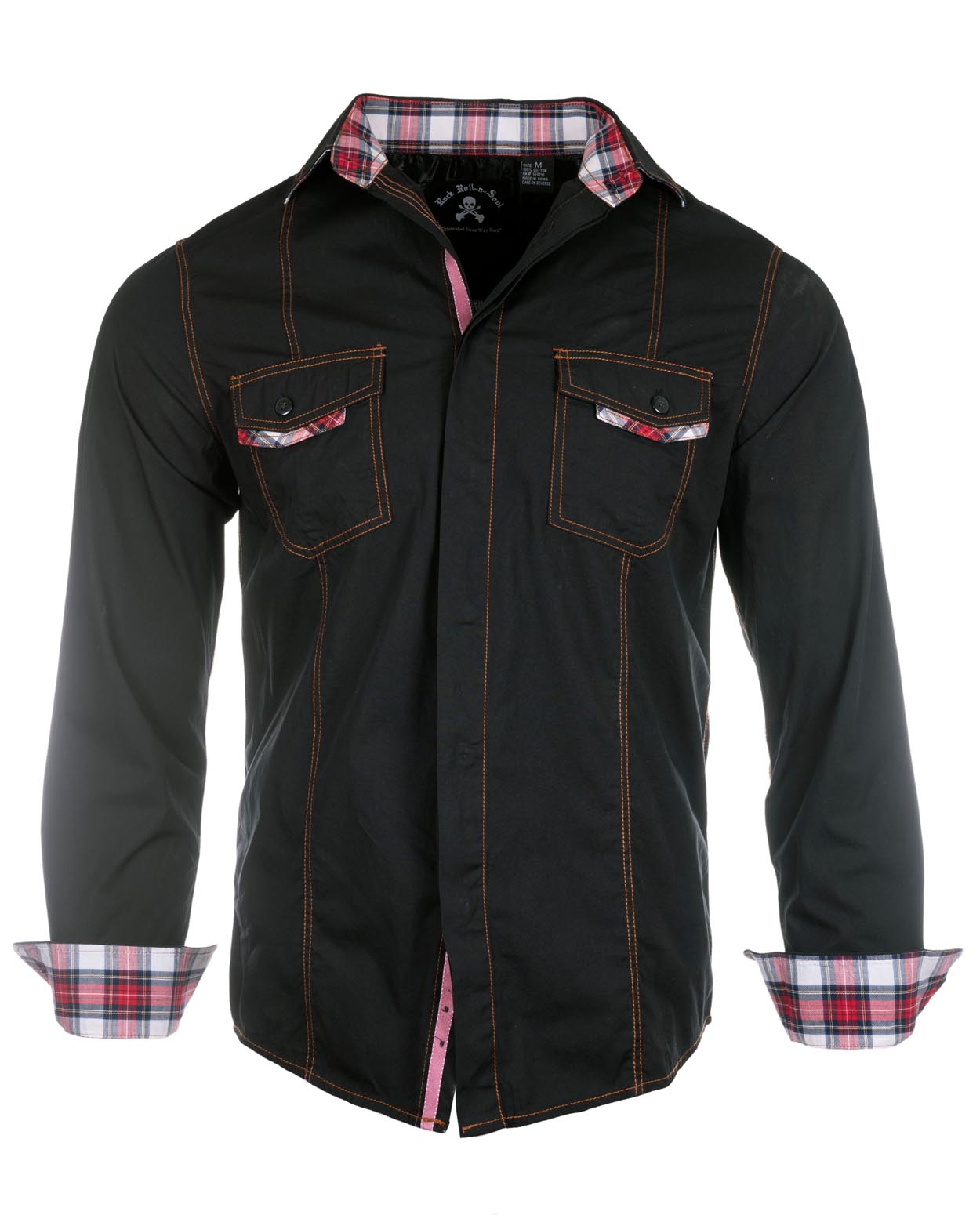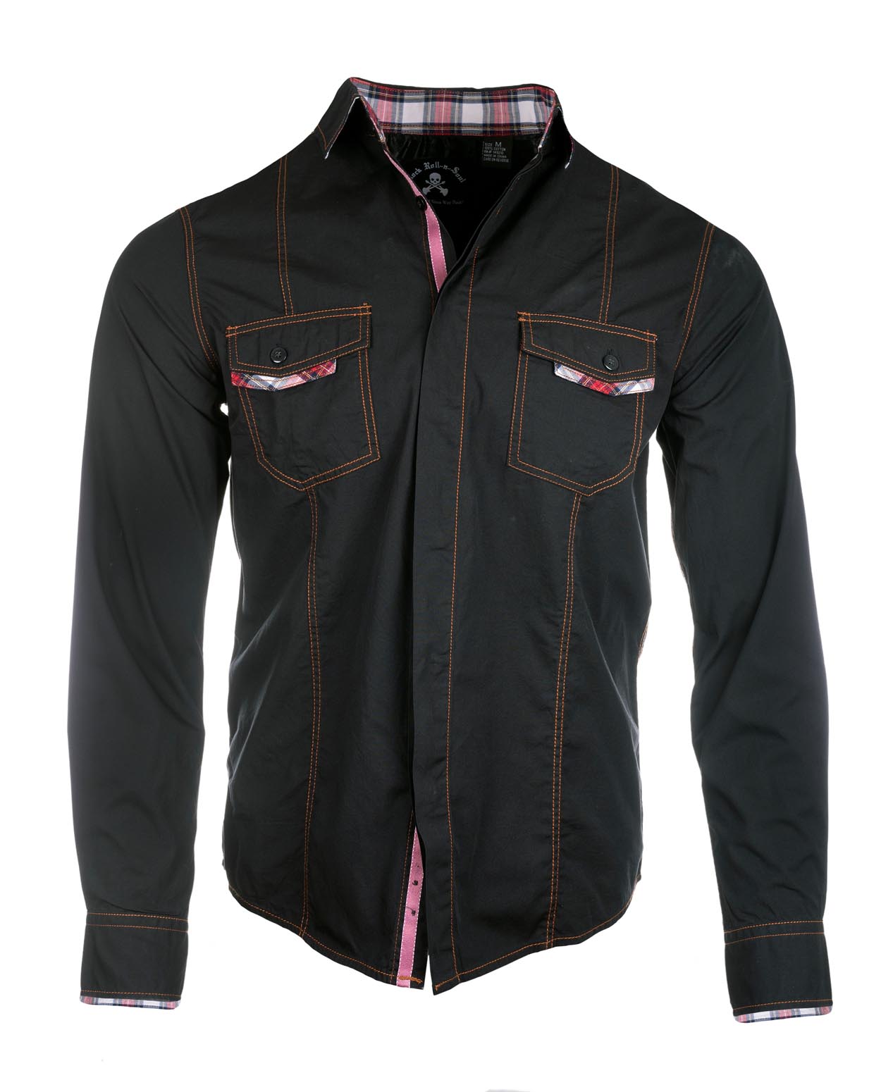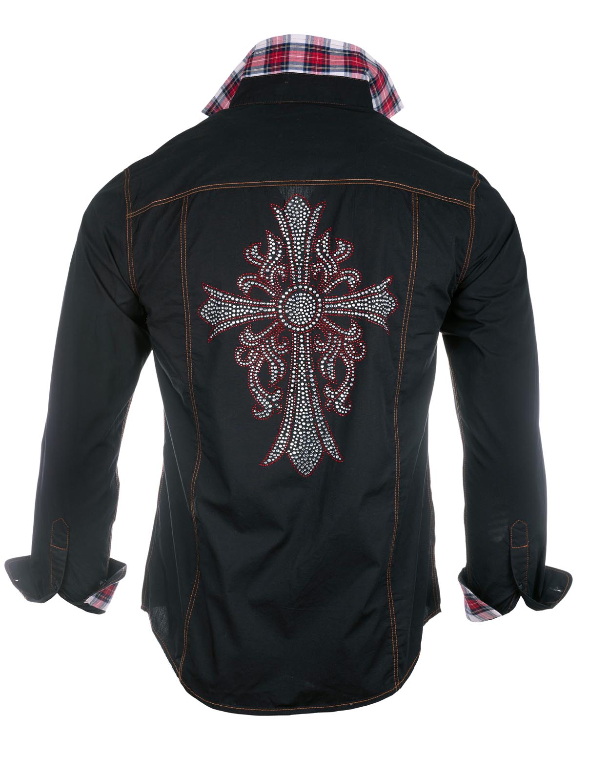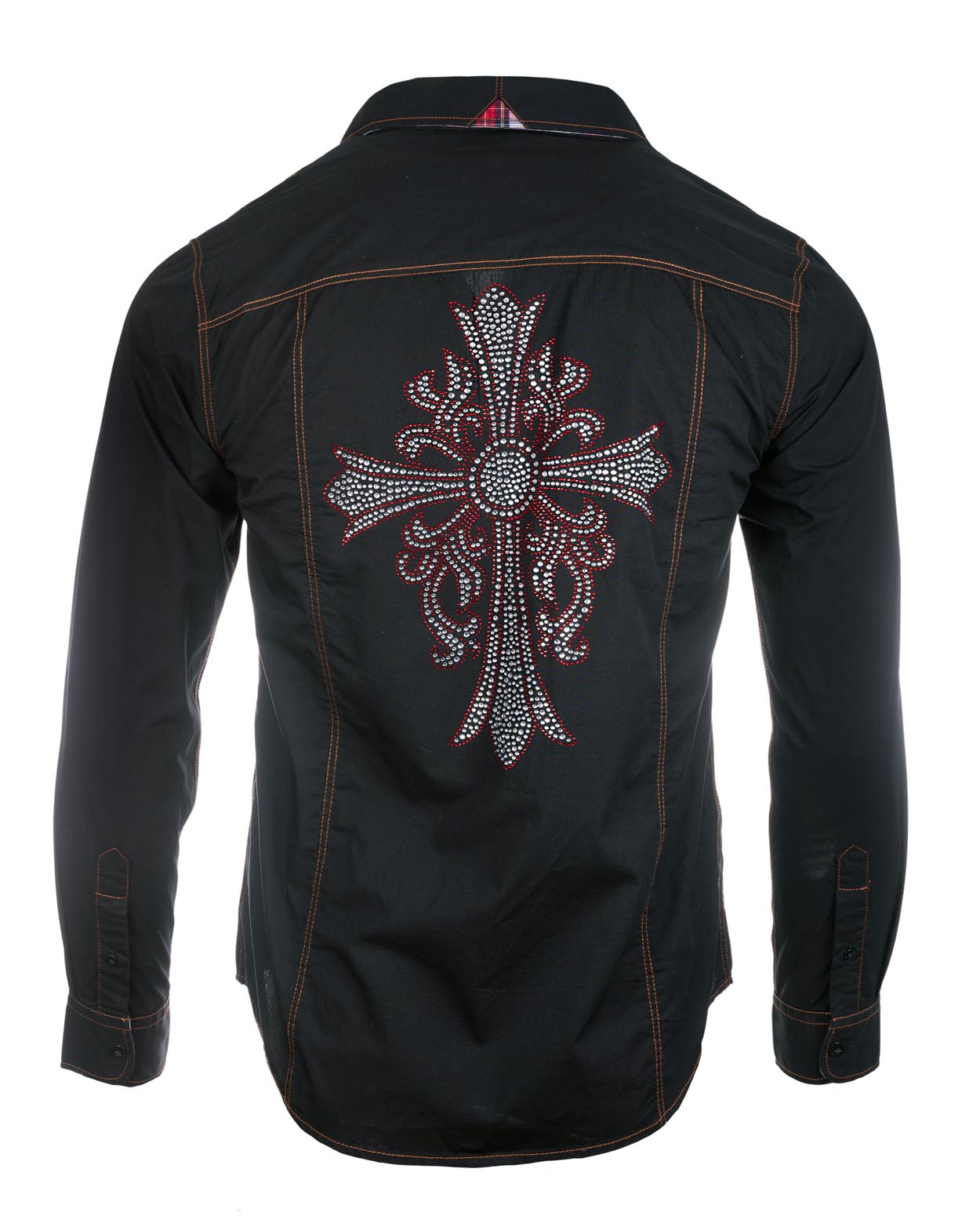 Men's Long Sleeve Button Up Cross Embellished Shirt in Black with Contrast Fabric Under Cuffs, Collar and Placket.