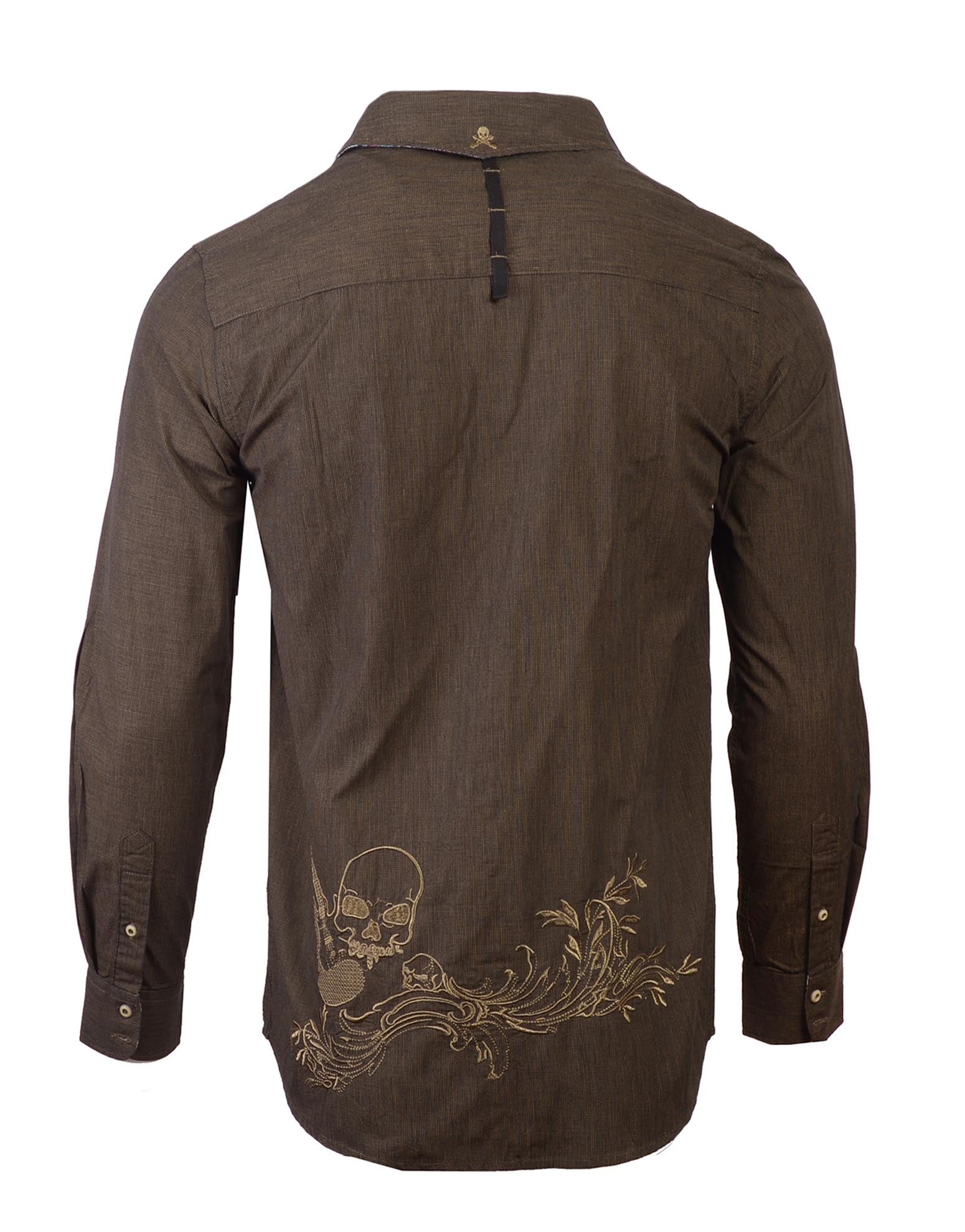 Men's Long Sleeve Button Up  Embroidered Sleeve Shirt with Contrast Fabric Under Cuffs, Collar and Placket.