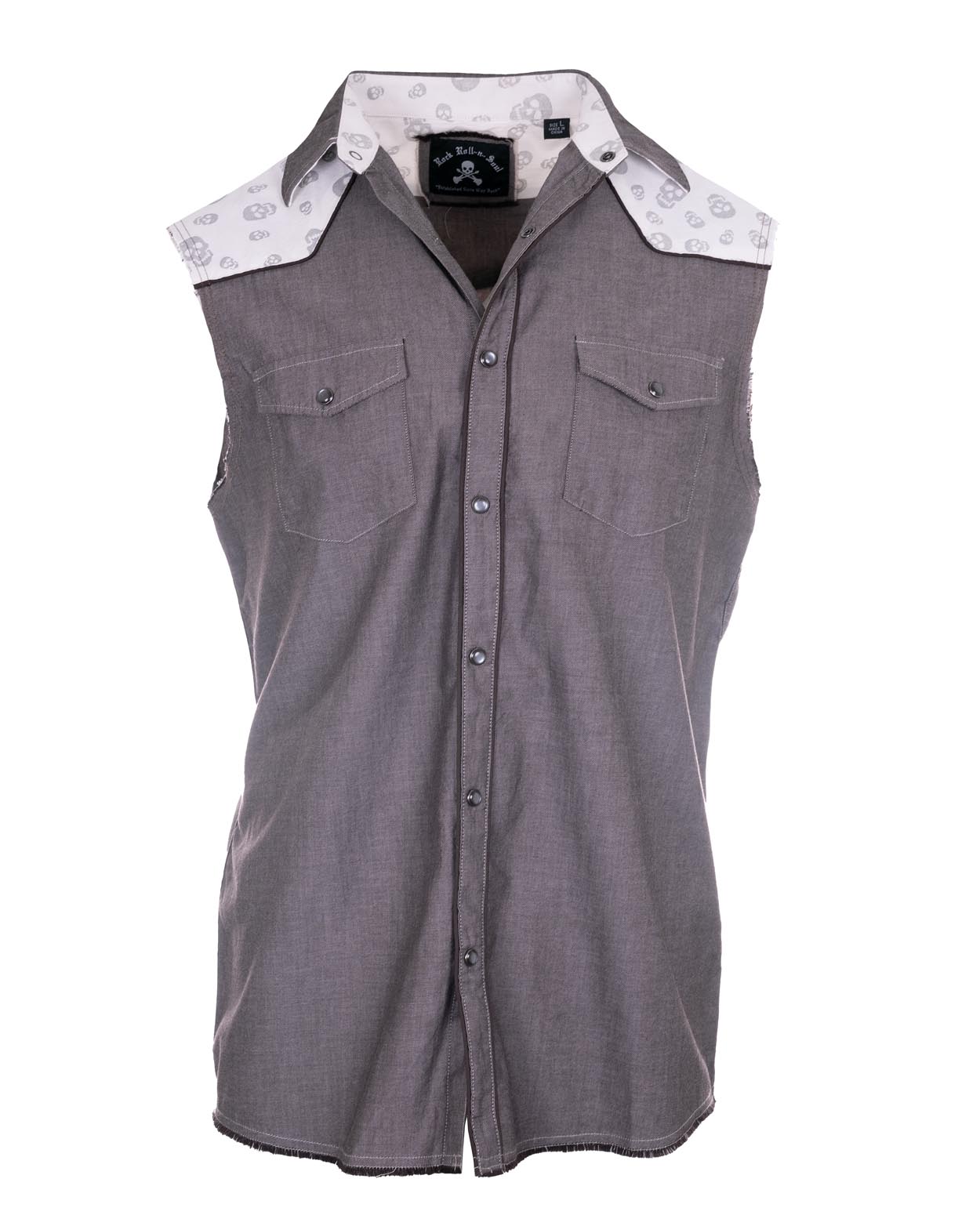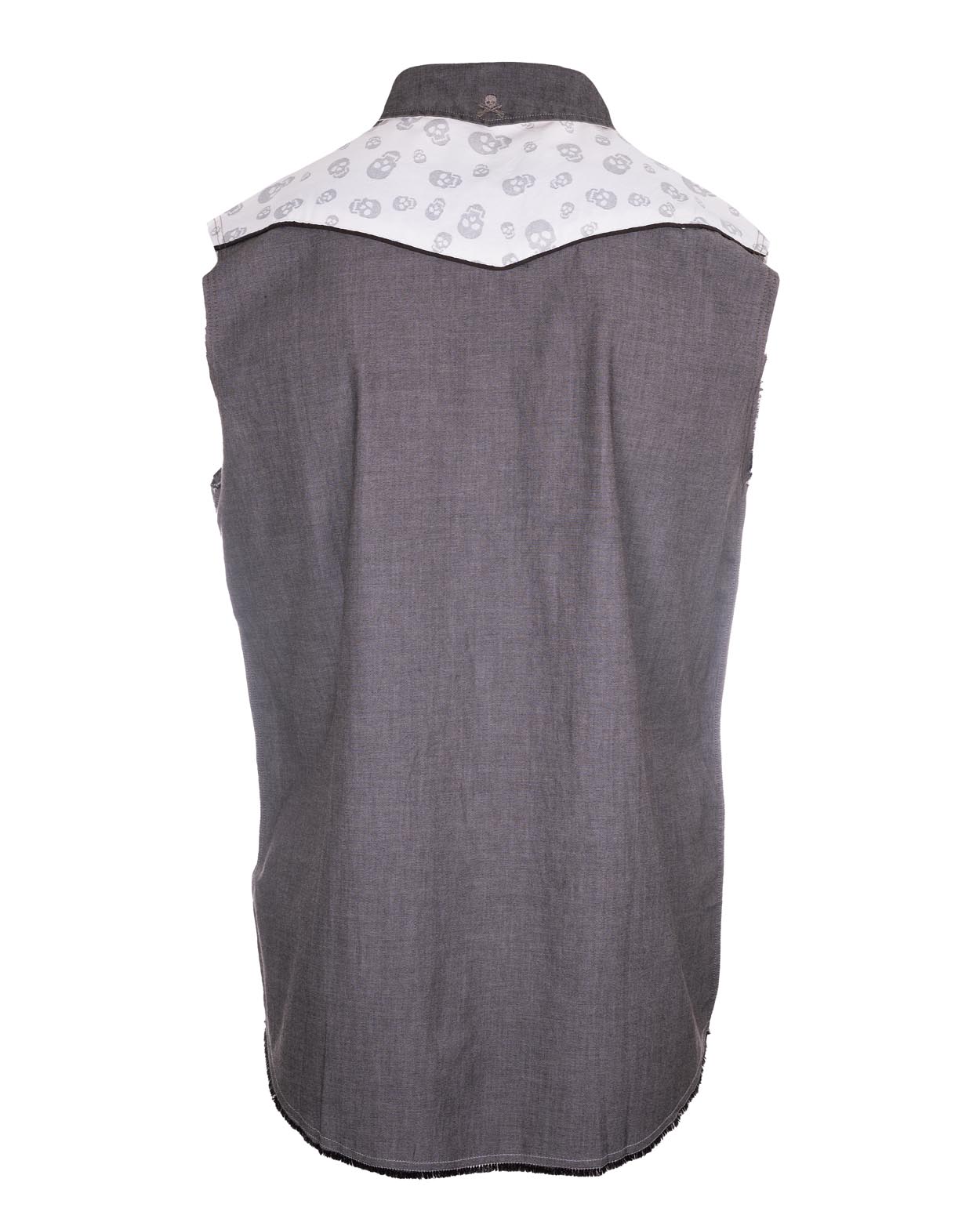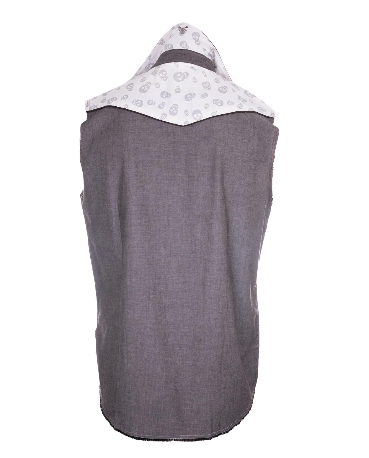 Men's  Western Inspired Sleeveless Snap Button Up Shirt with Contrast Skull Fabric Under Collar, Pocket  and inside Neck & Placket.